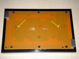 Danach hebt man die Platine ab. Wenn sich die Platine an den sechs Führungshülsen verhaken sollte, kann man vorsichtig mit dem Schraubendreher etwas hebeln. Nach dem Entfernen sieht man dann die Leitgummistücke der Tasten. Keine Panik, falls einer fehlen sollte, manchmal verklebt sich das Gummi mit der Platine, man kann es problemlos abziehen.