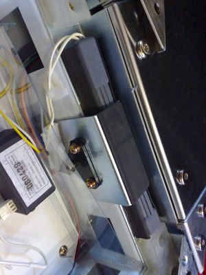 Desweiteren sind die Schalter in einer etwas härteren Gummischale eingelegt, damit dieser nicht verrutscht, aber auch eine gewisse Dämpfung und Federung vorhanden ist. Ein rechtwinkliges Metallstück mit etwas Moosgummi ist mit drei Schrauben so befestigt, dass dieses justiert werden kann, um die Sensitivität eines Pfeiles einzustellen.