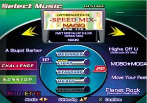 Die Hintergrundgrafiken der einzelnen Menüs wurden im Allgemeinen recht schlicht gehalten, bieten aber einen guten Überblick. Die Songauswahl besteht dieses Mal wieder aus einem drehbaren "Music Wheel" wie bei den allerersten Versionen. Das Rad mit den unterschiedlichen Songs dreht sich komplett durch den Bildschirm und läuft am unteren Rand rein sowie raus. Der gewählte Song wird oben groß angezeigt und sein Schwierigkeitsgrad kann inmitten des Rades abgelesen werden.