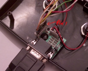 Jetzt öffnet Ihr die Controlbox und zieht den Stecker, der zu dem Playstation-Stecker führt, von der Platine. An dessen Stelle kommt euer neu gelötetes Kabel (mit Ader 1 von dem 15-poligen D-Sub weg zeigend). (Bild 4) Da ich die Box nicht direkt hinter meinem Rechner hängen haben will hab ich mir ein Verlängerungskabel besorgt. Ihr könnt natürlich auch gleich ein längeres Kabel - z.B. Druckerkabel - benutzen, dann müsst ihr nur selbst einen 7-poligen Stecker finden der passt.