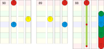 Die linke Spalte entspricht dem Countdowntimer. Die Farbe entspricht der Farbe der Noten im Spiel. Die horizontale Position zeigt, mit welchem Finger die Note gespielt werden sollte, ist das Notensymbol in der Mitte kann der Spieler wählen, ob mit dem linken oder rechten Finger gespielt wird.